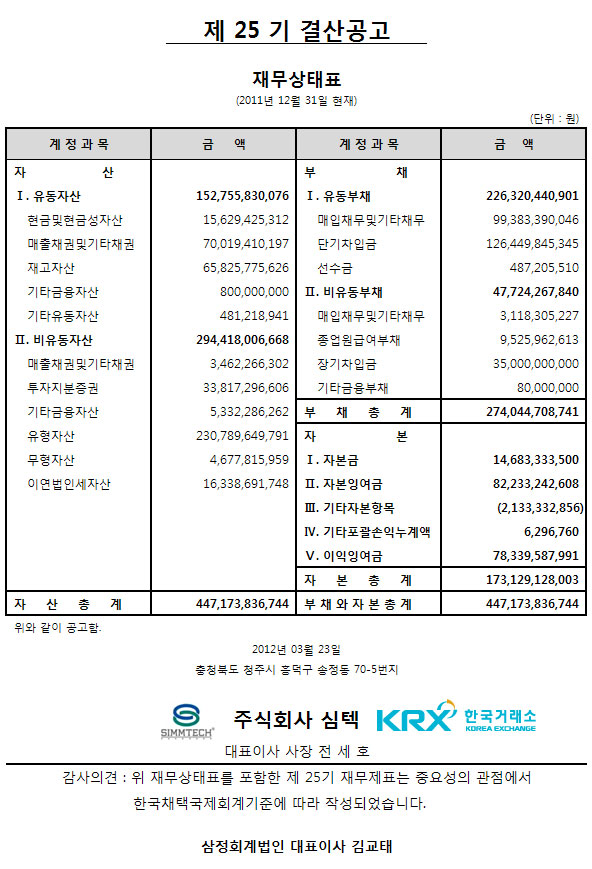 (주)심텍 '2012년도 코스닥 공시우수법인' 선정